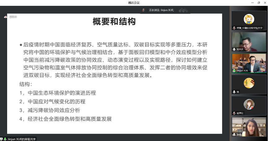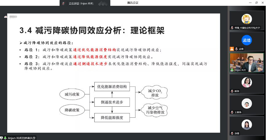 、气候变化经济学论坛、中国社会科学院大学国际交流与合作处联合主办。日本名古屋大学-中创碳投碳中和联合实验室主任薛进军教授作为主讲人,主题为《减污降碳政策的协同增效与实现路径分析》。讲座由伦敦大学学院孟靖副教授主持,来自中国社会科学院大学、北京大学、清华大学、南京大学、哈尔滨工业大学、中国科学院等高校及科研机构的五百多名师生参会。