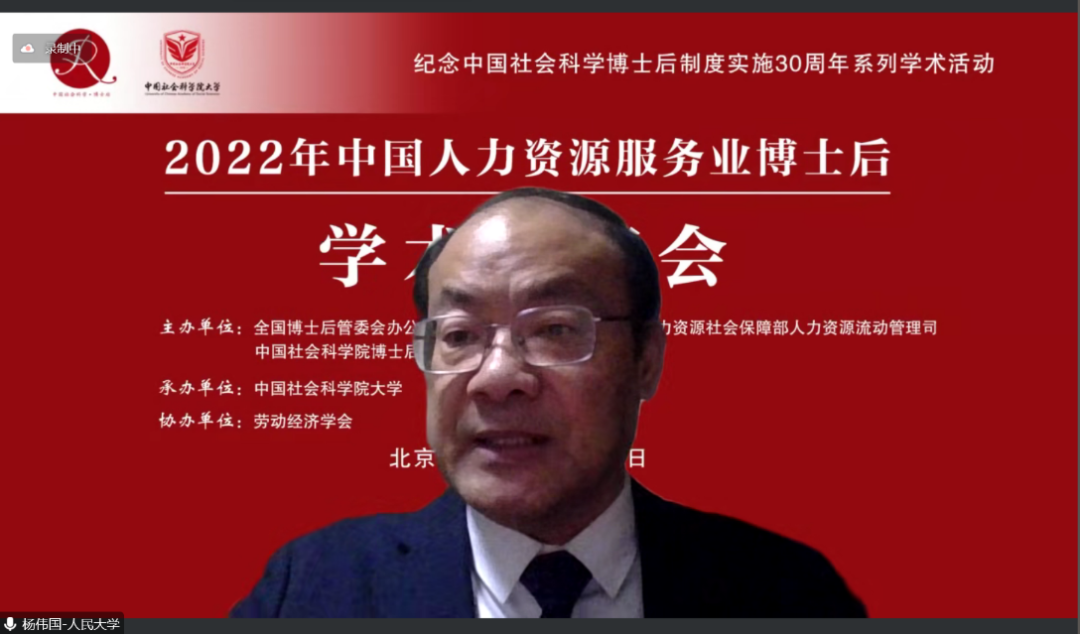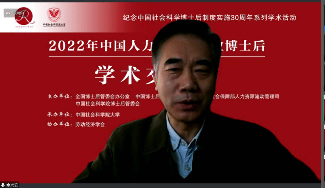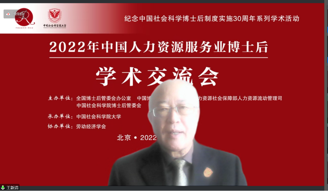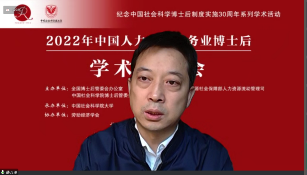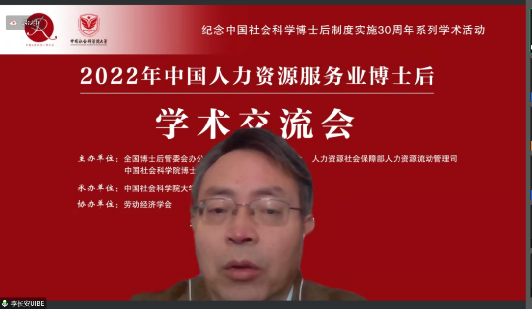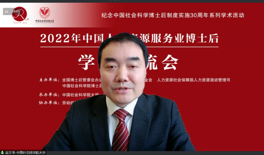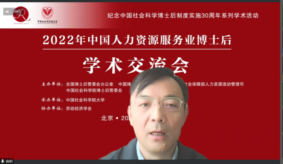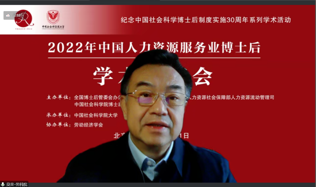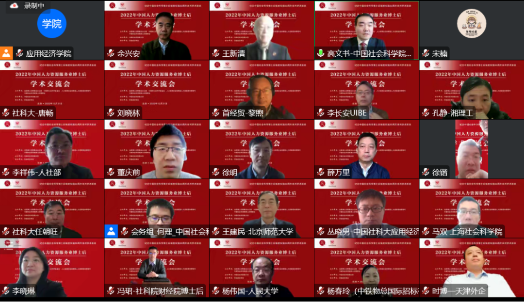 2022年12月31日,2022年中国人力资源服务业博士后学术交流会在线成功举办。本次学术交流会由全国博士后管理委员会办公室、中国博士后科学基金会、人力资源社会保障部人力资源流动管理司、中国社会科学院博士后管委会共同主办,中国社会科学院大学承办。与会专家学者以人力资源服务业为主题,围绕人力资源服务业高质量发展进行了多维度、多层面的研讨。交流会共设置了开幕式、主旨演讲、博士后论坛、闭幕式四个环节,400多人在线参会。