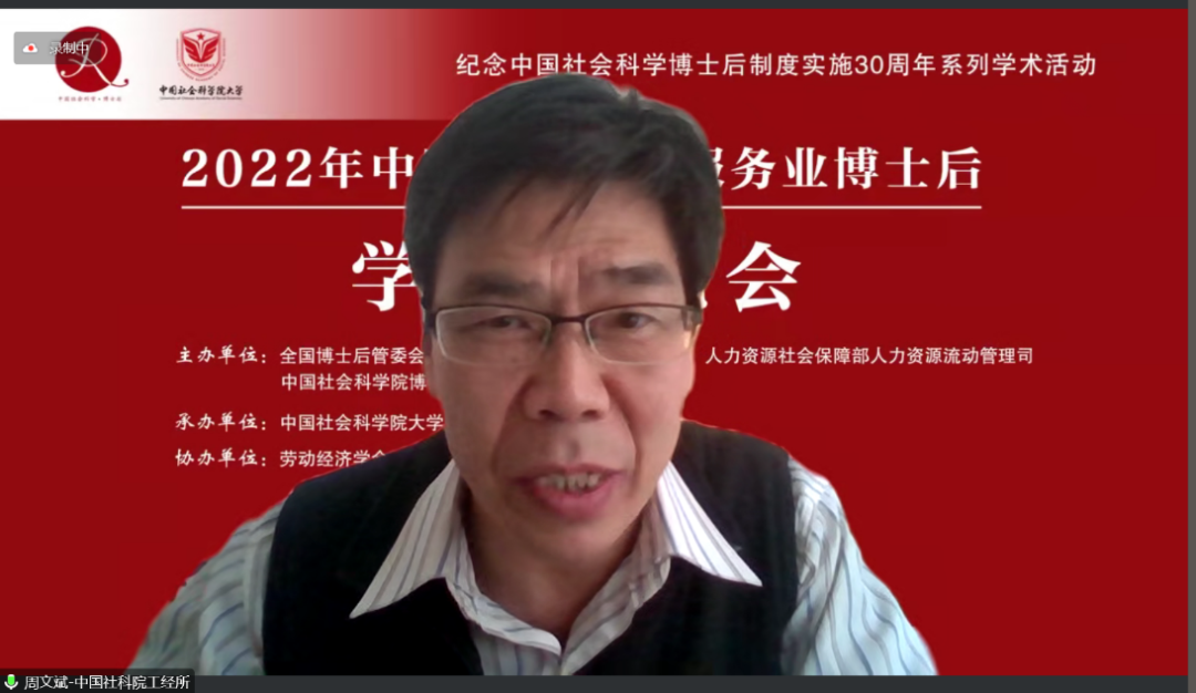 下半场由中国社会科学院大学教授任朝旺主持。华东交通大学经济管理学院教授周小刚,诚通人力资源有限公司研究员、中国社会科学院人口与劳动经济研究所博士后董庆前,复旦大学管理学院工商管理流动站博士后乐菡,中信银行总行正高经济师蔡宁伟,中国人民大学劳动人事学院博士研究生袁可等五名博士后及专家学者作了主题发言,首都经济贸易大学黎煦教授进行了点评。