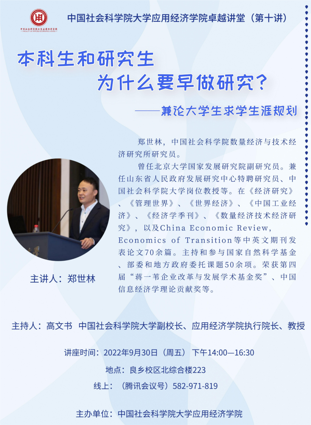 【讲座预告】卓越讲堂 第10讲丨郑世林:本科生和研究生为什么要早做研究?——兼论大学生求学生涯规划