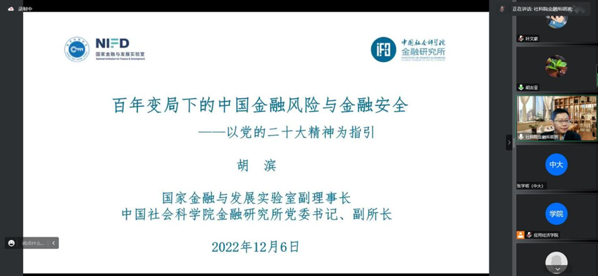 讲座第一部分,胡滨研究员通过党的二十大报告引出本次讲座主题。二十大报告指出我国发展进入战略机遇和风险挑战并存、不确定难预料因素增多时期。在这百年未有之大变局的历史背景下,我国面临哪些金融风险问题,以及我们该如何防范金融风险,维护金融安全是一个非常重要的课题。