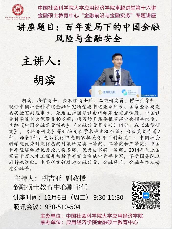 【讲座预告】卓越讲堂 第16讲丨胡滨:百年变局下的中国金融风险与金融安全