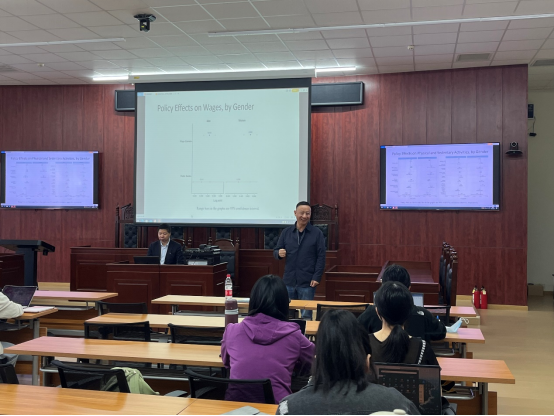 在讲座的第二部分,方涛教授介绍了他最近的一个研究《中国双休政策对劳动力供给、家务劳动和闲暇活动的影响》。首先,方涛教授介绍了我国双休政策的背景和动机。1995年,我国开始实施双休政策,目的是为了创造就业机会、提高生产力和改善居民工作与生活的平衡。但这一政策对劳动力供给的总体影响是不确定的,取决于居民偏好、经济发展阶段和居民对休闲、消费和工资收入之间的权衡。然后,方涛教授介绍了这一研究采用的方法。这一研究基于Chang et. al(2007)的方法,考虑了政府部门和私人部门,将一周的时间分为上班时间、家务劳动与休闲时间、睡觉时间,消费、家务劳动和闲暇活动、睡眠三者带来的效用之和构成了消费者的总效用。这一研究选取了中国家庭健康与营养调查1989-2011年的数据,将1995年定为政策实施的时间,运用DID模型分析一周双休制政策带来的影响。实证结果显示,当实施一周双休制政策后,居民第二份工作的工作时间显著增加,私人和公共部门的工作时间显著减少,出人意料的是,做家务劳动的时间也显著减少了。为检验实证结果的合理性,这一研究在进行了一系列的稳健检验后结论保持一致。最后,方涛教授基于研究结论,从微观角度对劳动力市场提出若干思考。