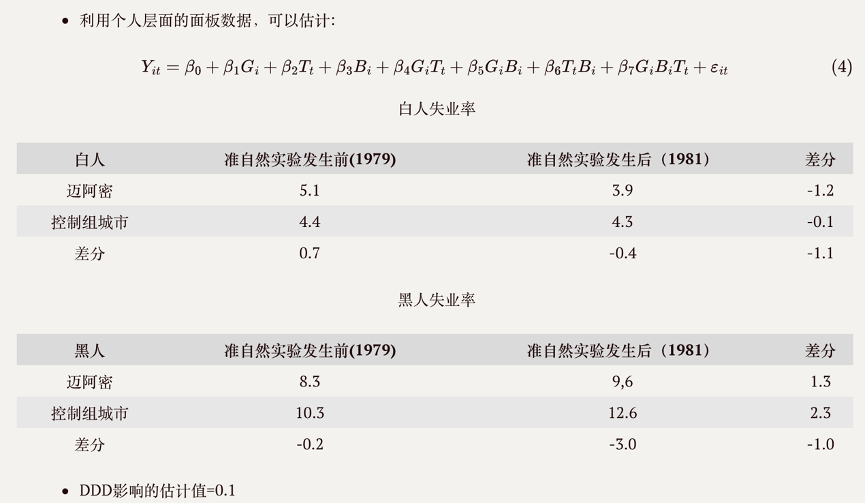 随后,尤老师以Card(1990)的论文(The Impact of the Mariel Boatlift on the Miami Labor Market)为例,介绍了DID及DDD的基本原理。根据Card,1980年马里尔升船事件使当年迈阿密的劳动力增加7%。若选取马里尔升船事件为一次准自然实验,以迈阿密为处理组,其他未受难民影响城市为对控制组,可以构建双重差分模型。估计结果显示,难民潮对迈阿密白人失业率的影响为-1.1%。
