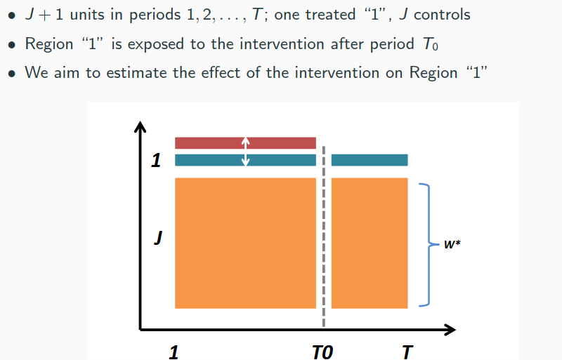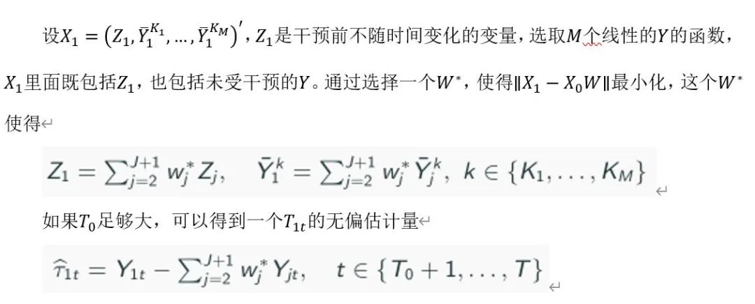 之后,徐老师介绍合成控制法的理论模型。模型本质和DID模型没有差别,合成控制法加入了交互项