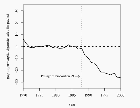 计算加州与合成加州人均香烟消费之差(即处理效应)