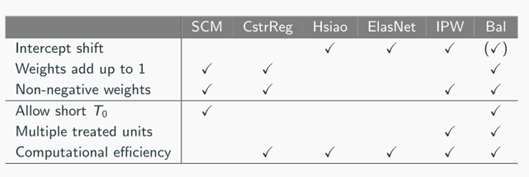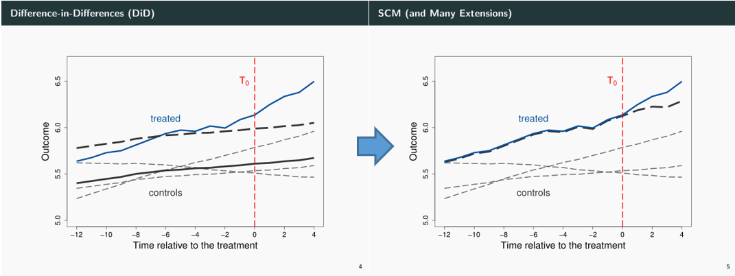 当DID干预前预测能力差的时候,SCM允许每个控制组用不同权重加权拟合出一条和处理组在事前相似的趋势,作为对Yit(0)的预测。