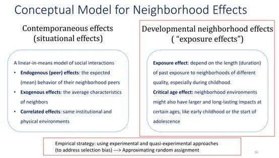 为了进一步探究因果关系,陈老师介绍了邻里效应的概念模型。居住在不同地点会带来三种效应:人群互动效应(受到周围人行为的影响)、社区特征影响、相关影响(相同机制、安排和环境等)。这三种效应难以区分,因此目前的文献大体都是研究地方的总体效应。而效应产生的源头包括暴露效应和关键年龄效应,这两种源头可以稍作区分。