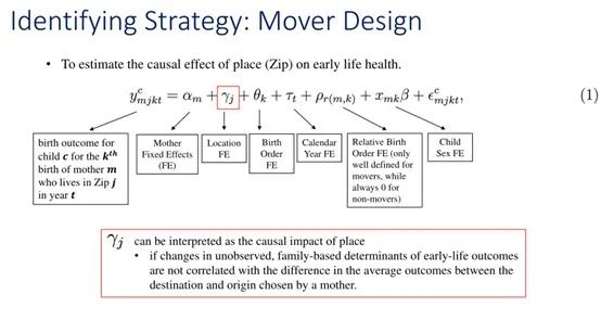 之后,陈老师以NBER working paper30424 “Place effects and geographic inequality in health at birth”为例讲解了如何识别地点效应,从而接近因果关系研究。该文利用加州过去三十年所有出生记录,对比同一个母亲搬迁前后生的孩子的出生体重情况。为了尽量接近因果,捕捉到地理总体效应,需要剔除掉母亲的个体效应。具体识别模型如下: