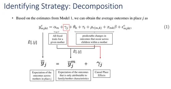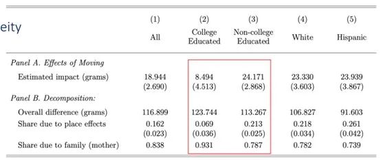 ycmjkt表示t年住在邮政编码为j的地区的母亲m所生的第k个孩子c的出生体重。模型控制了母亲的效应、地点效应(每个邮政编码有一个固定效应)、出生顺序、年份、相对出生顺序(搬迁后第一个孩子为0,搬迁前-1,-2…,搬迁后0,1,2…)、孩子性别等变量。核心是求得地点固定效应γj。为了尽量接近因果,捕捉到地理总体效应,需要剔除掉母亲的个体效应。此时有,搬到j的所有母亲生产的孩子的期望体重=搬到j的母亲的特征+地点效应,因此可以做差分识别γj。