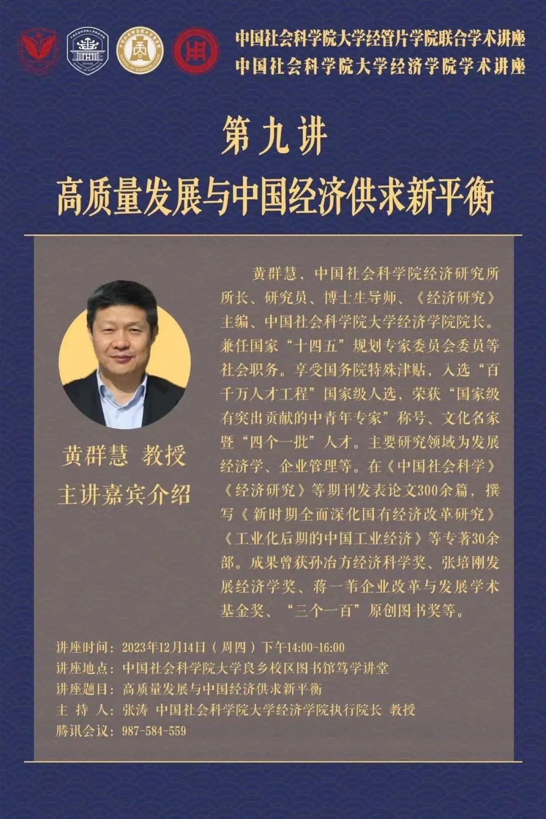 讲座预告|中国社会科学院大学经管片学院联合学术讲座 黄群慧:高质量发展与中国经济供求新平衡