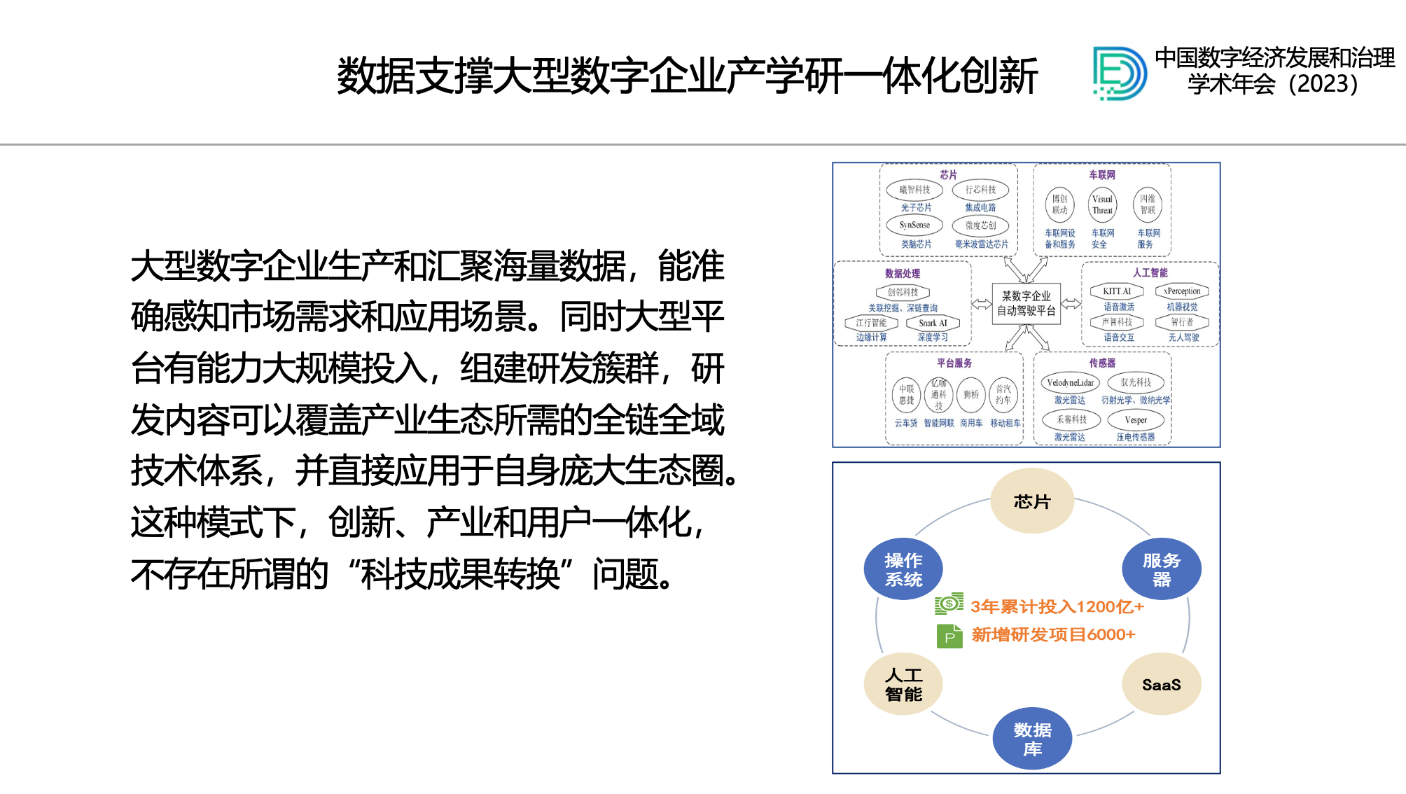 我们的初步结论是,数智时代的创新,一个重要特征就是数据主导地位的出现和企业创新主体地位的加强。数字时代,数据成为重要的创新要素,大型数字企业是海量数据的生成者、使用者和交易者,在创新链条中的地位是显著上升。一是数据支撑大型数字企业产学研一体化创新。大型数字企业生产和汇聚海量数据,能准确感知市场需求和应用场景。同时大型平台有能力大规模投入,2021年中国研发投入规模前3强都是数字企业,它们能组建研发簇群,研发内容可以覆盖产业生态所需的全链全域技术体系,并直接应用于自身庞大生态圈。某自动驾驶平台作为枢纽,组建包含芯片、车联网、数据处理、人工智能、传感器等自动驾驶创新网络。这种模式下,创新、产业和用户一体化,不存在所谓的“科技成果转换”问题。二是数据支撑大型数字企业从事前沿技术创新。大型数字企业具有巨量链接和海量数据获取、处理与迭代能力,是数字前沿技术的重要创新力量。在自动驾驶、云计算、渲染引擎、虚拟现实等前沿数字技术领域,国内发明专利企业占比超80%,国际发明专利排名前20位的均为企业,明显高出一些典型的传统领域。三是数据支撑大型数字企业从事基础研究。某企业在人工智能基础研究方面,发力机器学习、视觉技术、语音、自然语言处理等四大方向前沿技术,已于AAAICVPRICLRIJCAI等国际人工智能顶会发表超600篇文章。四是数据支撑大型数字企业投资新创企业。平台拥有海量多元和异构数据,对数字相关领域创新方向高度敏感,同时具有较强投资能力。2021年中国独角兽排名前100的企业中,62.39% 独角兽企业获得来自大型数字科技企业的投资,在A轮和B轮获得数字科技企业投资比例为47.86%