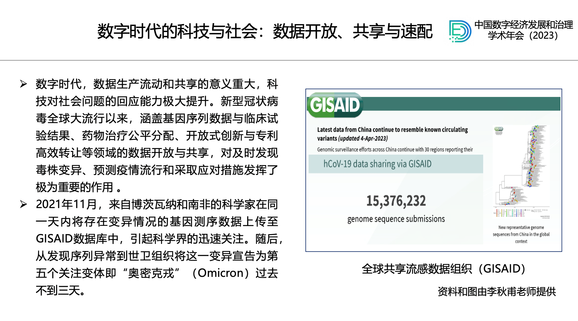 先看一个例子,在新冠大流行时期,WHO和很多药品机构共同设立了涵盖基因序列数据、临床试验结果、药物治疗公平分配、开放式创新的数据开放平台,这个平台非常有效,平台上各方都承诺只要有了新的专利、新的数据测序就立马放上去,这对全球疫情的毒株变异预测和采取应对措施发挥了非常重要的作用。202111月,来自博茨瓦纳和南非的科学家在同一天内将存在变异情况的基因测序数据上传至开放科学平台GISAID上,引起科学界的迅速关注。不到三天的时间世卫组织将这一变异宣告为第五个关注变体即“奥密克戎”(Omicron),这是在以往疫情流行病学中出现不了的速度。