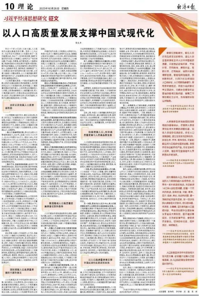 作为一个有14亿多人口的大国,人口是现代化建设最基本的支撑。党的十八大以来,习近平总书记围绕人口发展发表了一系列重要论述,作出了一系列科学判断,强调“中国式现代化是人口规模巨大的现代化”“我们想问题、作决策、办事情,首先要考虑人口基数问题,考虑我国城乡区域发展水平差异大等实际,既不能好高骛远,也不能因循守旧,要保持历史耐心,坚持稳中求进、循序渐进、持续推进”“人口发展是关系中华民族伟大复兴的大事,必须着力提高人口整体素质,以人口高质量发展支撑中国式现代化”。这些重要论述是习近平经济思想的重要组成部分。