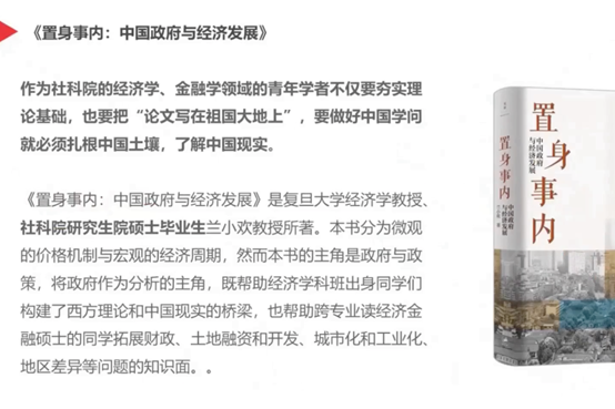 随后,宋盈盈同学分享了《长安十二时辰》一书,从书籍内容出发,为同学们讲述了丰富多彩的古代文化知识;郭晓婷同学为大家推荐了《幸福之路》,讲述了导致快乐与不快乐的原因,与大家分享了幸福的秘诀;最后,李豪同学为大家推荐了《置身事内:中国政府与经济发展》、《原则:应对变化中的世界秩序》,向同学们发出了不仅要夯实理论基础,更要将“论文写在祖国大地上”的号召。