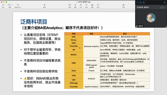 经验分享:袁佳宇学姐结合自己的申请经历,向准备申请美硕的同学们详细介绍了泛商科项目,重点分析了纯MPP/MPA项目的利弊。同时,学姐为有出国意向的同学们提出了现阶段选课和实习的具体建议。针对同学们提出的是否应该寻找中介、本科院校的议价能力如何等问题,学姐给出了详细的回答,并建议同学们与其原地焦虑,不如在提前申请前积极进取,将能完成的申请工作做到尽善尽美。