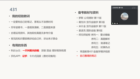 经验分享:魏千承学长首先向同学们介绍了自己择校备考过程中的准备工作,接着,学长结合亲身经历,给出了政治、英语、金融学综合等具体科目的备考建议,并推荐了一些网课、参考书和实用的应用程序。最后,学长介绍了贸大复试考核的具体细节以及复试过程中自己的经验与教训,建议同学们不要忽视口头表达的练习。