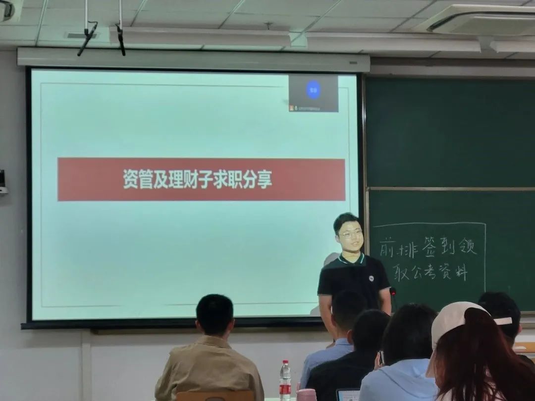 张浩文学长带来了资管及理财子求职分享。学长简要介绍了自己暑期实习获得留用的求职经历,介绍了银行理财子公司就业方向的优劣点,也为同学们分析了目前的就业形势,鼓励同学们都能获得理想职位的Offer。