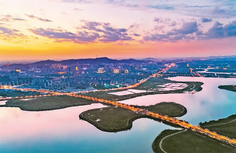 中国式现代化是人与自然和谐共生的现代化。近年来,安徽淮北市有力提升采煤塌陷区改造工作,以生态修复为基础,实施南湖、乾隆湖、绿金湖、碳谷湖、古乐湖、朔西湖等六大塌陷湖泊治理工程,城市中心正逐步形成100多平方公里的中心湖带和国家城市湿地公园,淮北人民“拥湖发展”的梦想从蓝图变成现实。图为昔日荒草废滩的采煤沉陷地,变成了美丽的生态公园。人民图片 牛旭东/摄