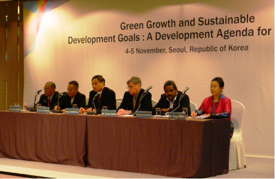 2013年11月,陈迎研究员(右一)在韩国首尔参加“绿色增长与可持续发展目标”国际学术研讨会。