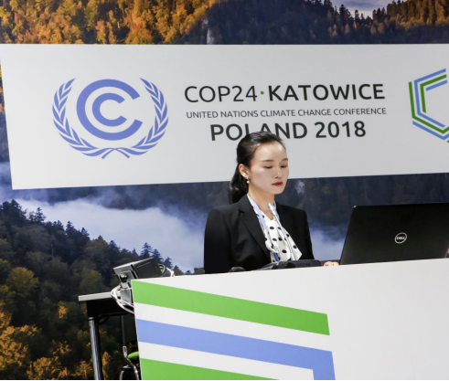 2018年12月,禹湘副研究员(左一)在波兰卡托维兹参加联合国气候谈判大会(COP24)期间在边会上做学术报告。
